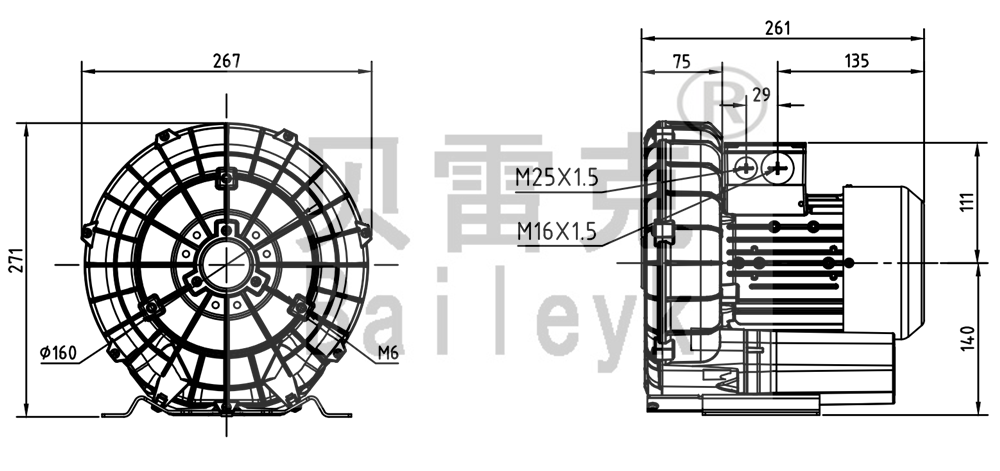 最大風(fēng)量:100m3/h 最大正壓:120mbar 最大負(fù)壓:110mbar 防護(hù)等級(jí):IP55 噪音:55db 重量:11Kg |