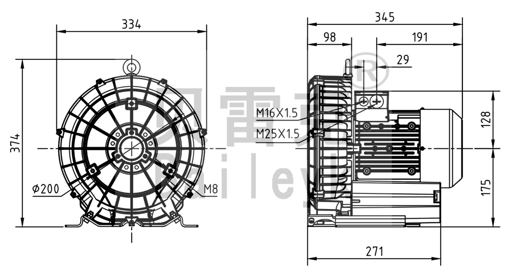 最大風(fēng)量:210m3/h 最大正壓:190mbar 最大負(fù)壓:200mbar 防護(hù)等級(jí):IP55 噪音:64db 重量:23Kg |
