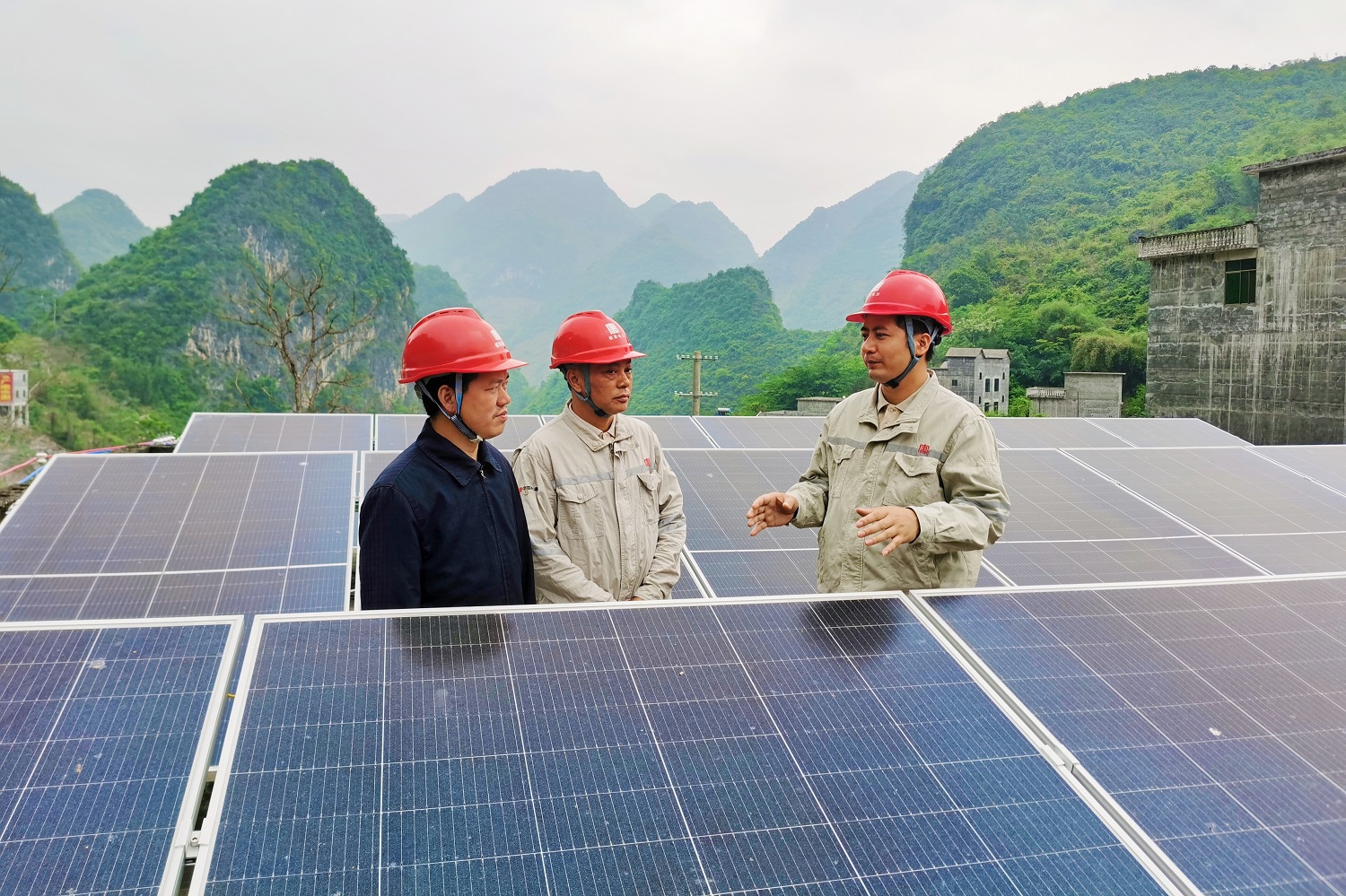 駐村工作隊(duì)與施工單位人員正在查看光伏板安全情況