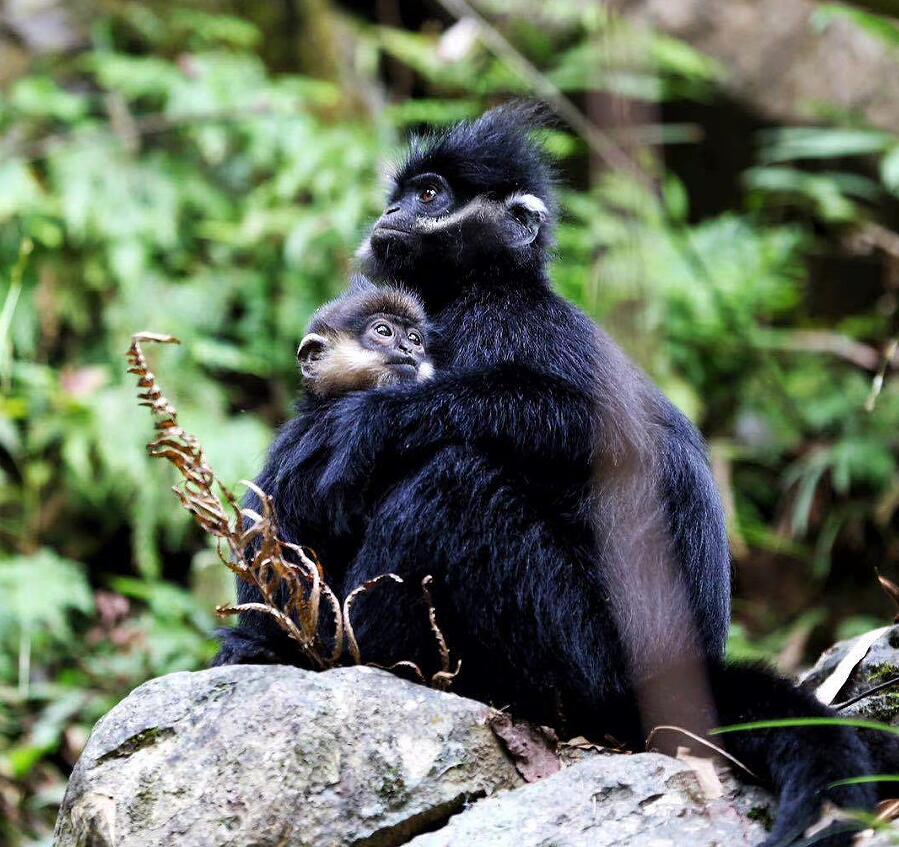經(jīng)過(guò)長(zhǎng)途奔波,快艇行駛到貴州省沿河縣境內(nèi)的“麻陽(yáng)河國(guó)家級(jí)自然保護(hù)區(qū)”。山上傳來(lái)各種表達(dá)不同“情緒”的叫聲,在生態(tài)環(huán)保專業(yè)崗位奮斗8年之久的饒振祺朝密林中一指:“快看,那就是黑葉猴!發(fā)出‘嘎,嘎’的叫聲,說(shuō)明它們處在愉快的覓食狀態(tài)中;‘噢、噢’就是它們?cè)谏搅珠g攀援前進(jìn)的信號(hào)?!碧а弁ィ瑤r石間、樹蔭深處不斷有黑葉猴迅捷地跳躍。它們頭頂冠毛蓬松,通體黑色,兩頰雪白的“絡(luò)腮胡”格外醒目,看起來(lái)像銀須飄飄的“小老頭”。有的黑葉猴懷里還抱著“金寶寶”——幼猴毛色金黃,隨年齡增大變黑。