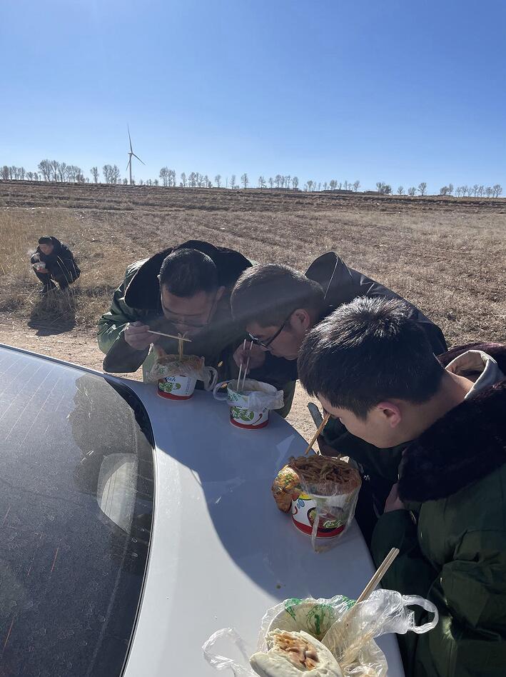 在風(fēng)場值班時,一日三餐只能是泡面、自熱米飯這類速食品。為方便下班的同事吃飯、保證飲食安全,大家在住宿賓館附近選擇一家小餐館,作為值班回來就餐的“定點食堂”。接上完成交接班的同事們,我們一起去體驗了“食堂”。晚餐過程中,大家說說笑笑,精神狀態(tài)很不錯,完全看不出已經(jīng)在風(fēng)場風(fēng)餐露宿了兩周多時間。
